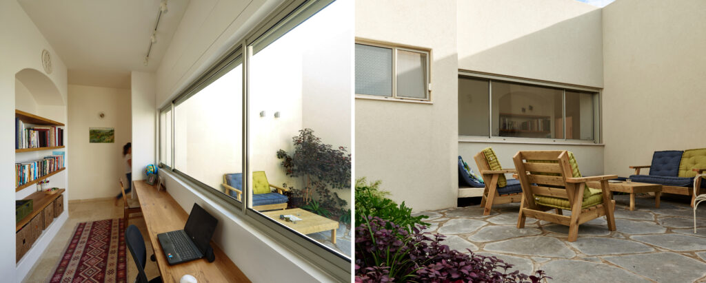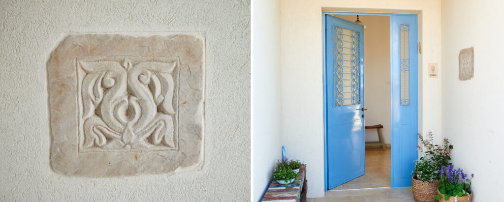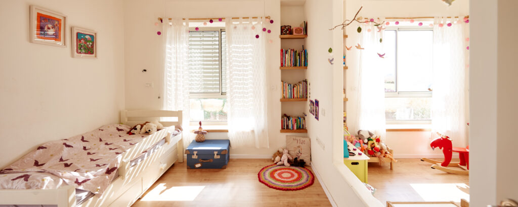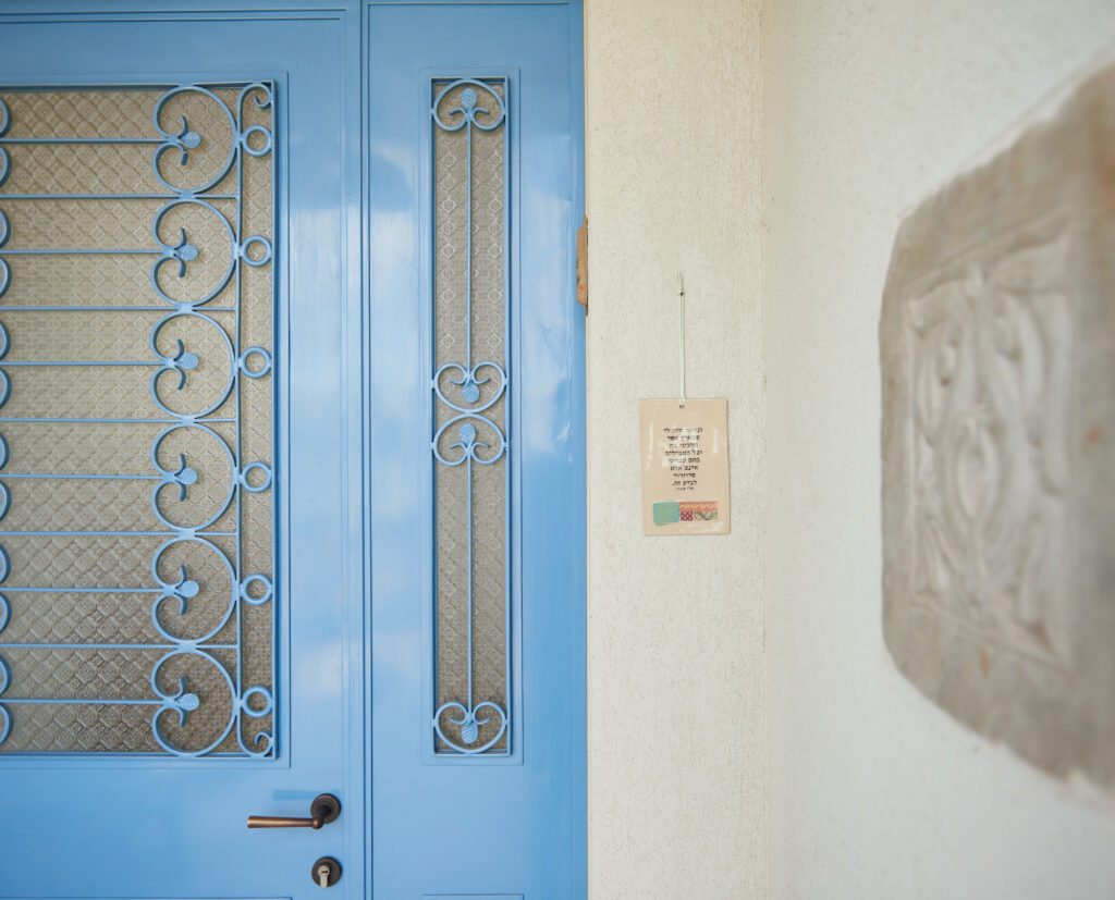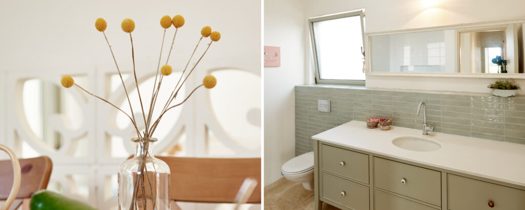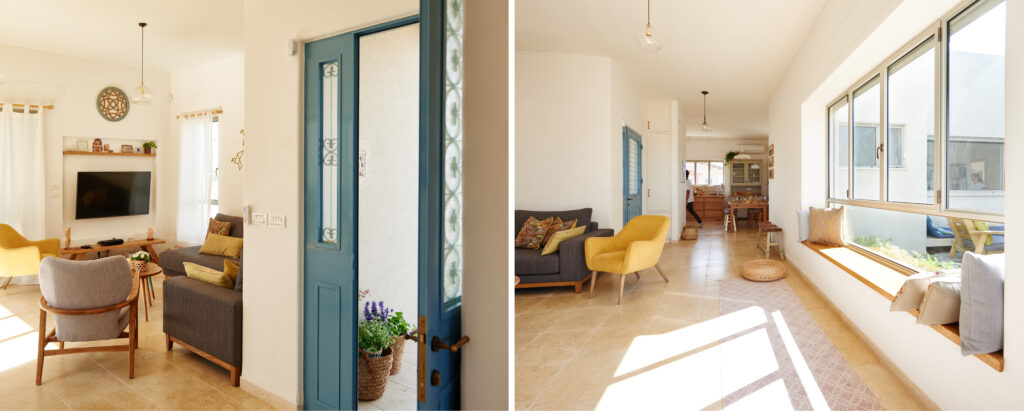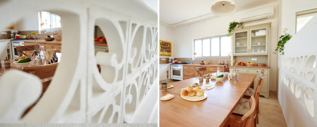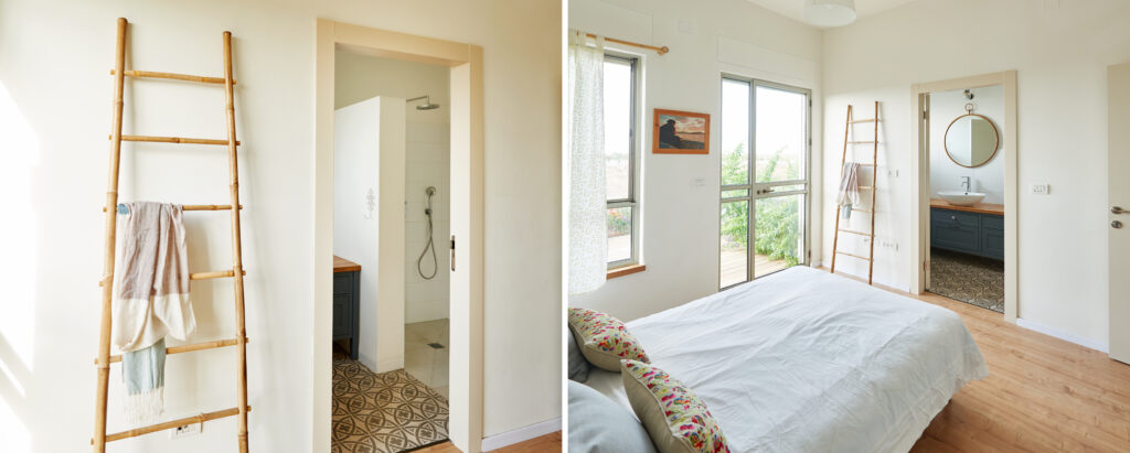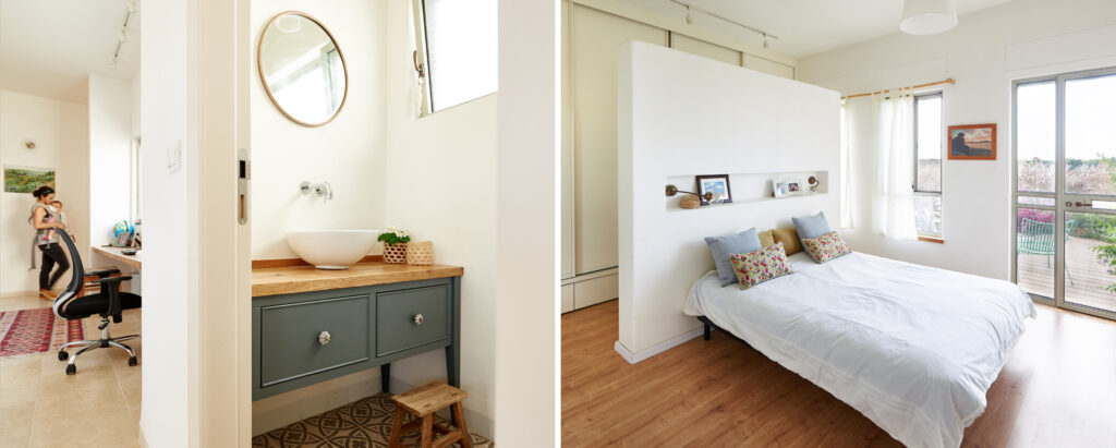 גם כאן חוזרים פרטים המזוהים עם עבודתי: פתח המחבר בין חדרי הילדים, חותמת האבן בכניסה, ודלת ומבואה שתוכננו יחד בקפידה – אלו מהווים את כרטיס הביקור של הבית.