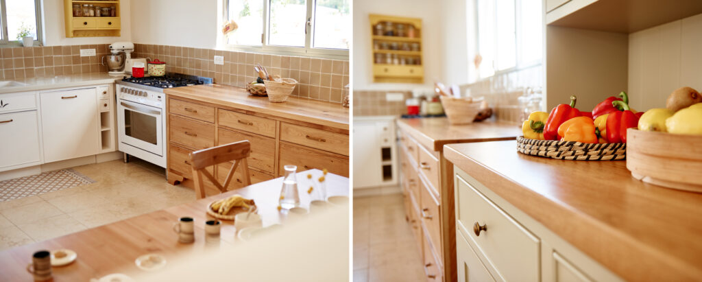 המטבח תוכנן כשילוב סגנונות, ומרגיש כמו אוסף מחלקי חיים שונים שהתעצב לאורך זמן. דלת הכניסה עוצבה יחד עם הנפח, עד לפרט האחרון, ומוסיפה למראה האקלקטי של הבית.